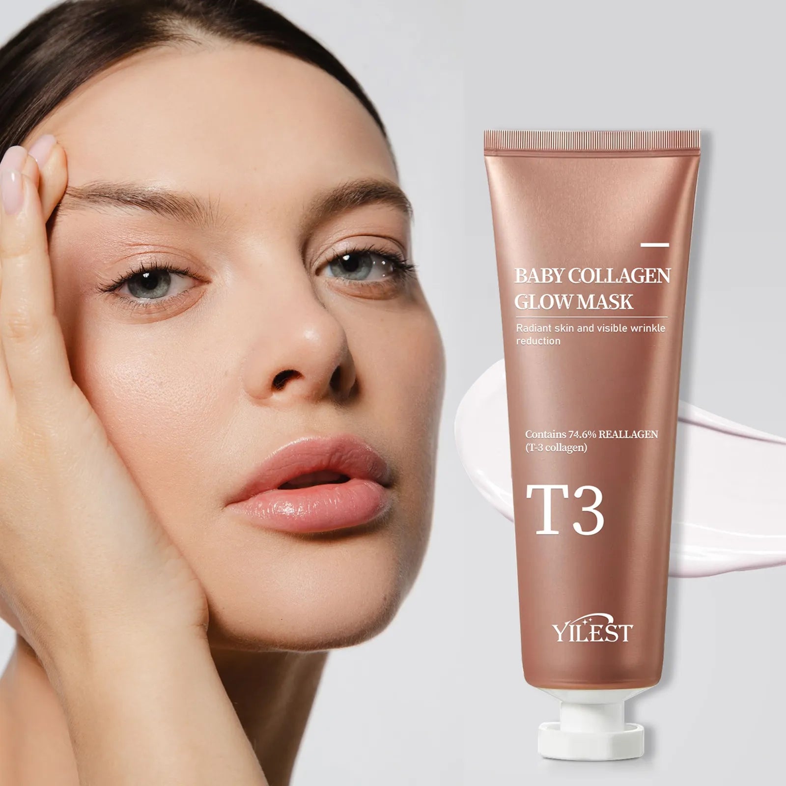 A hydrating facial mask formulated with collagen, designed to moisturize, soothe, and soften skin. Each set includes a 70ml mask, a packing box, and a scraper for easy application.